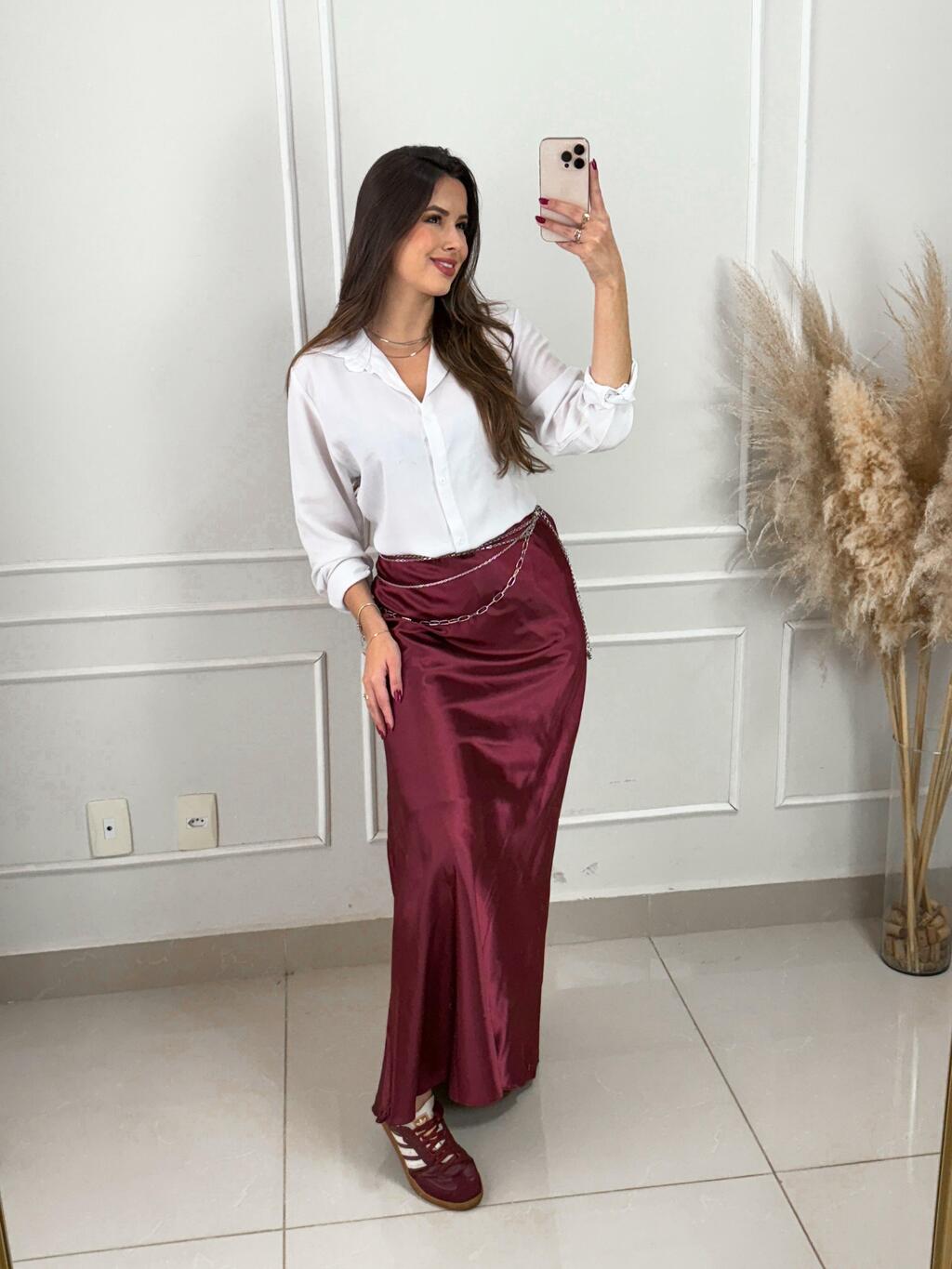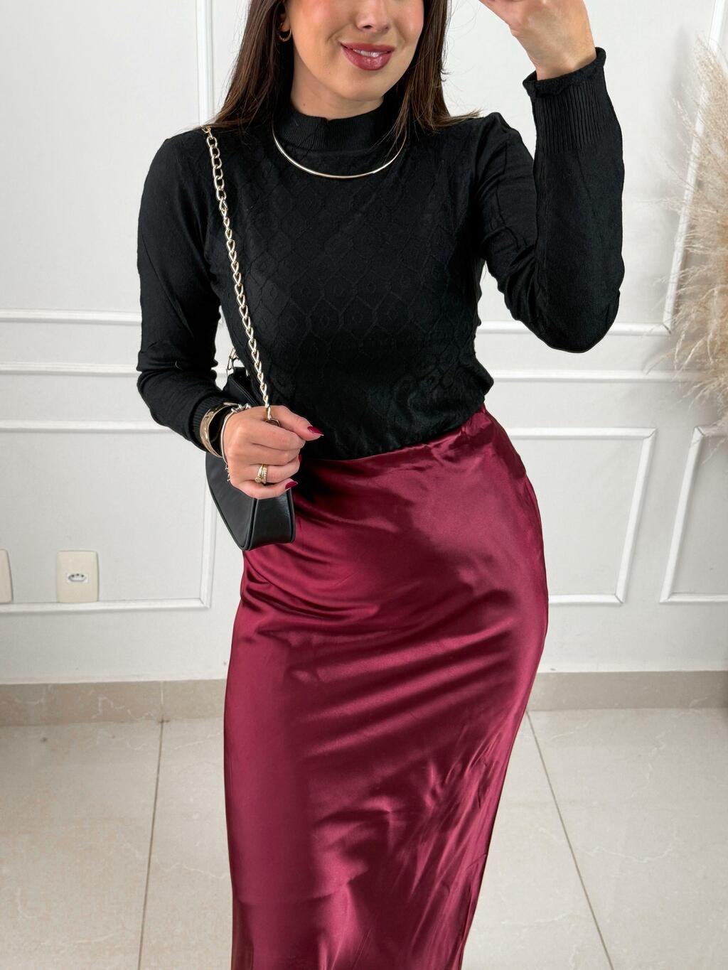 Elegante e atemporal, a saia longa em cetim traz sofisticação com seu caimento fluido e brilho sutil. O tecido leve valoriza o movimento e garante conforto, enquanto a modelagem ajustada no quadril com leve abertura na barra alonga a silhueta. Ideal para compor looks refinados, ela transita com facilidade entre ocasiões especiais e produções mais modernas com pegada casual chic.